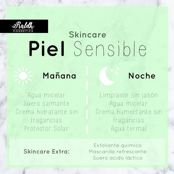 Piel sensible: su piel es fina, clara, a veces un poco seca, se descama en superficie, enrojece fácilmente (puede ser el principio de una cuperosis).